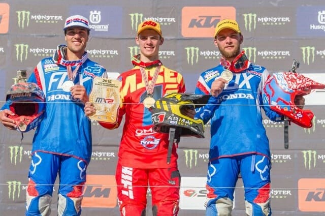 Tim Gajser (center) took 1st in MX2! Gautier Paulin (left) and Evgeny Bobryshev (right) are also Rekluse riders. Photo: HRC.