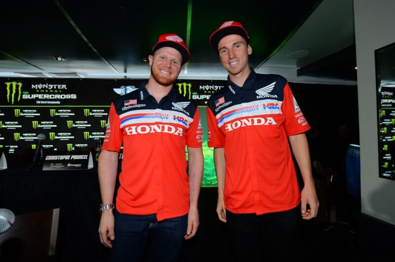 After months of preparation and anticipation, the 2016 AMA Supercross season is set to kick off Saturday at Anaheim, California’s Angel Stadium, where Team Honda HRC riders Trey Canard and Cole Seely yesterday participated in photo shoots and a pre-event press conference.