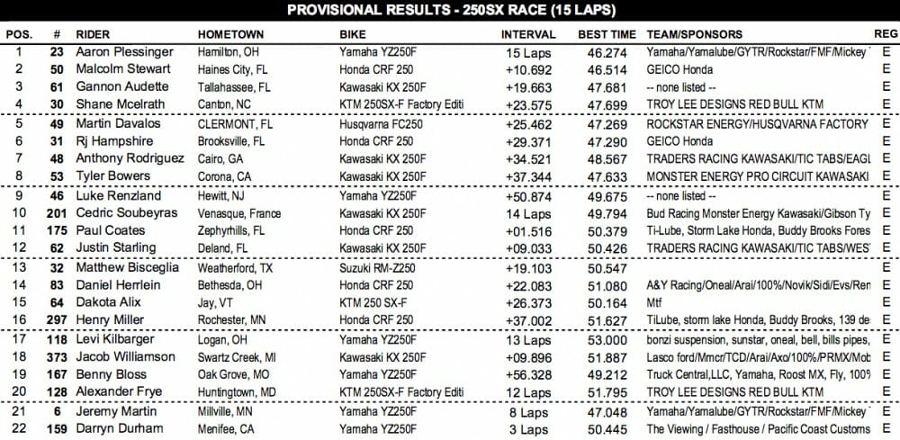 As Plessinger and Stewart pulled away out front, Audette lost two more positions to both Martin and Davalos. The top four riders settled into position until just past the halfway point when a big crash from Martin not only took him out of third, but also out of the race. That allowed Davalos to move into third for four laps until a crash while attempting to get around lappers caused him to lose two positions. As a result, Audette found himself back in a podium spot.