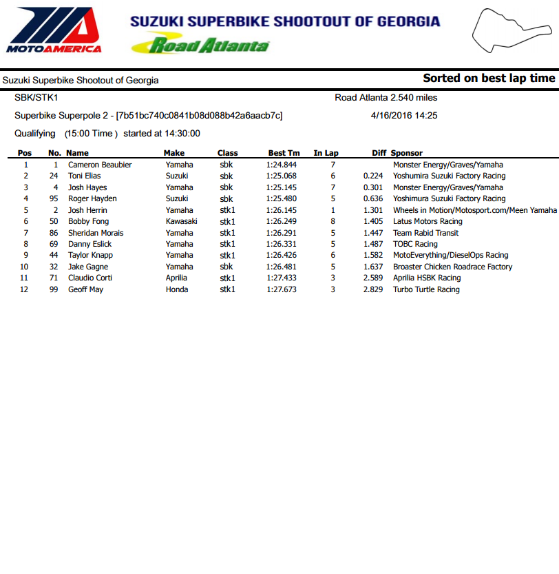 Beaubier, who crashed and finished fourth in the two races at Circuit of The Americas a week ago, rebounded to earn the sixth Superbike pole position of his career on a sunny day at Road Atlanta during qualifying for the Suzuki Superbike Shootout of Georgia.