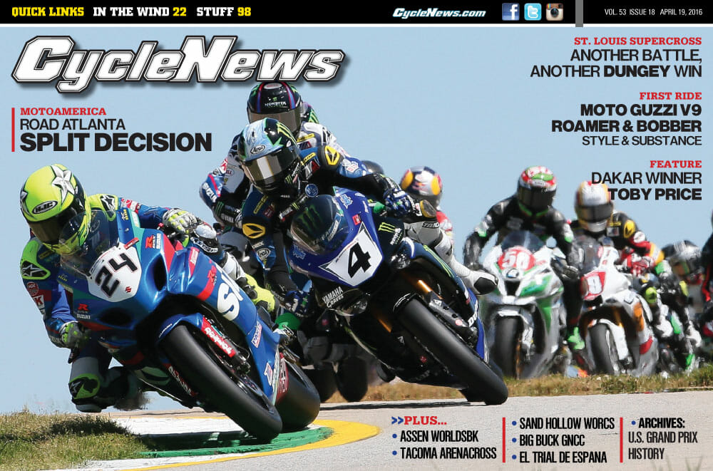 MotoAmerican held its first stand-alone race of the year and it was a weekend full of action at Road Atlanta. In St. Louis, Ryan Dungey and Ken Roczen continued their battle in the Monster Energy AMA Supercross Series, while the 250SX East Series produced its first repeat winner of the year; plus, we get you caught up with all the racing action from around the country and the world. We also give you the story behind Toby Price, the enthusiastic Aussie who one this year’s Dakar Rally, and Alan Cathcart tells you what it’s like to ride Moto Guzzi’s new V9 Roamer and Bobber. It’s all right here and just a click away. And it’s all FREE!