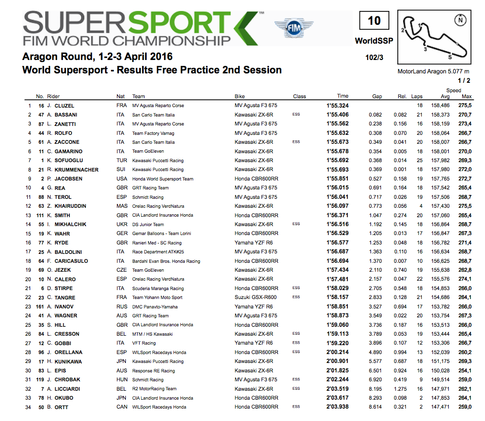 PJ Jacobsen (Honda World Supersport Team) ended his day ninth and first Honda rider home. Gino Rea (GRT Racing Team MV Agusta) was the final rider inside the top ten. A whopping 34 riders qualified for Superpole 1 or 2, to be held on Saturday.