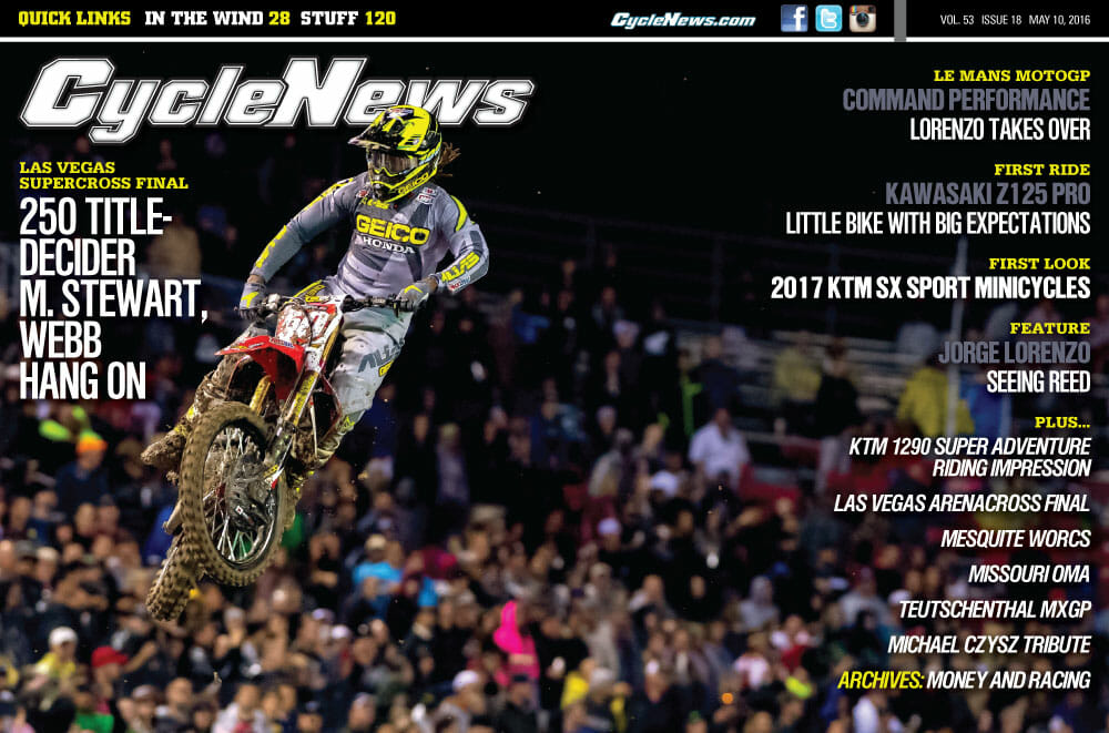 In this week’s issue of Cycle News magazine, we feature Malcolm Stewart on the cover for winning his first supercross championship in the 250SX East division. Both Stewart and Cooper Webb ended the 2016 Monster Energy AMA Supercross Series by claiming the 250SX titles, while Ryan Dungey finished of the 450SX class win another victory. In France, Jorge Lorenzo blew everyone away and Michael Scott tells you how he did it. Scott also talks more about Lorenzo and his eventual departure from Yamaha to Ducati and what it all means, and CN Road Test Editor tells you what it’s like to ride the new Kawasaki Z125 Pro. There’s plenty more, too. We get you caught up with all of the latest news in the motorcycling world. It’s all FREE and just a click away.