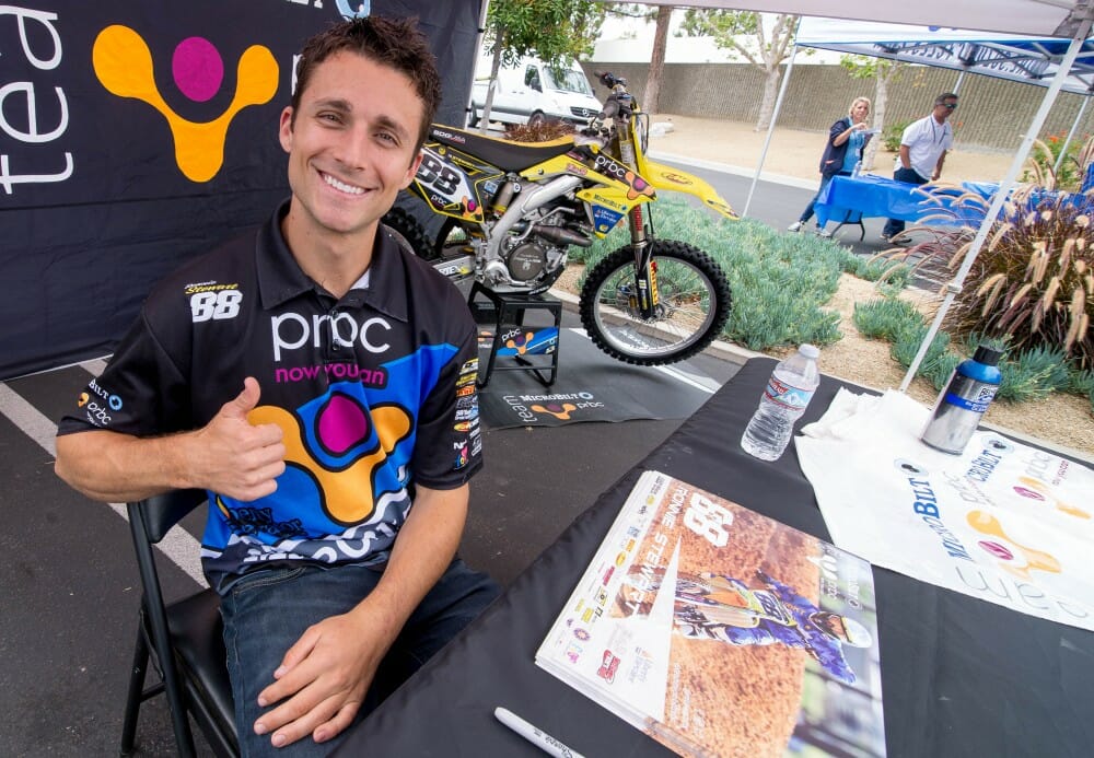 Despite his left arm in a sling from the Hangtown National MX, Yoshimura Suzuki’s James Stewart attended the event and signed autographs for many of the Suzuki employees and their families. He said that his shoulder is very sore, but he is still going to try and race the Glen Helen National this Saturday. He’ll officially make the decision to race or not Saturday morning. He said that the shoulder actually “popped out” when he hit a bump which actually caused the crash that took him out of the first moto and the rest of the day at Hangtown. He added that’s he’s had trouble with the shoulder before but that was many years ago. Stewart is obviously very discouraged how the year has gone so far but is trying to stay positive and plans to stick it out. Photography by Kit Palmer