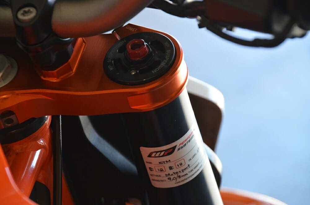 Initially, former KTM factory Superbike racer Chris Fillmore and I started with a 180N/mm spring in the rear from the WP catalog. This, we soon realized, was way too hard even for Fontana, let alone the bumps we’ll see at Pikes Peak. We also didn’t have enough range of adjustment from the KTM PowerParts WP race shock—the Super Duke’s rebound was nothing short of violent. We’d already maxed out on the clickers and gotten nowhere, so the shock was sent back to WP for a re-valve and now we have a much wider scope of adjustment, along with the 170N/mm spring in the PowerParts catalog.