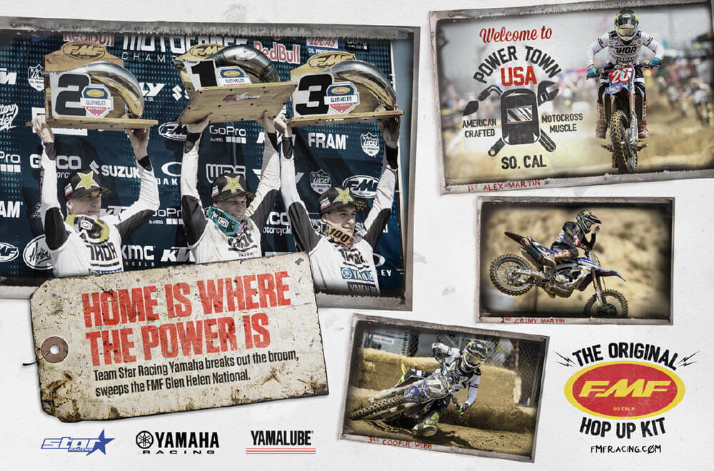 FMF was the proud sponsor of round two of the Lucas Oil Outdoor Motocross Championship at Glen Helen this past weekend. The FMF backed Star Racing Yamaha team swept the podium with Alex Martin taking his first career win just ahead of his brother Jeremy. Cooper Webb rounded out the podium.