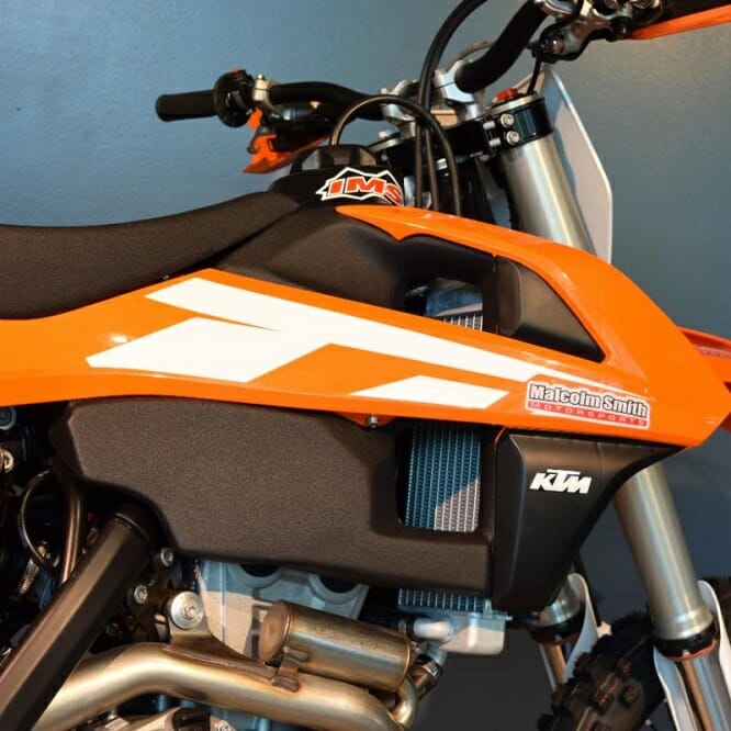 The 4.5-gallon tank offers an extra 2.7 gallons over stock. The IMS Products engineers incorporated the new KTM frame into the design and have plumbed it to flow efficiently.