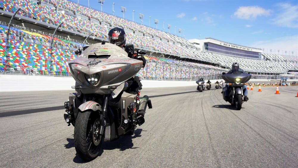 Grizzly rode away from Daytona International Speedway on March 12 flanked by hundreds of owners of Victory motorcycles who joined him to ride one lap of the Daytona 200 road course and escort him out of town for the first part of his journey.