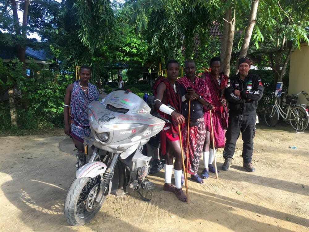 Time and position measurement for Grizzly’s record-setting ride were done via GPS and satellite tracking. Timing was not stopped on overland routes (i.e., when waiting to pass a country border or when the rider is sleeping). However, timing was stopped for air and sea transfers between continents and restarted once the bike arrived on the new continent.