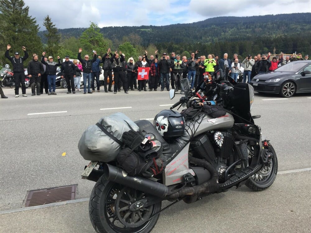 MINNEAPOLIS — July 11, 2016 — Victory Motorcycles® is proud to announce that Swiss endurance rider Urs “Grizzly” Pedraita has achieved a new world record by riding across five continents in less than 120 days aboard his Victory Cross Country Tour.
