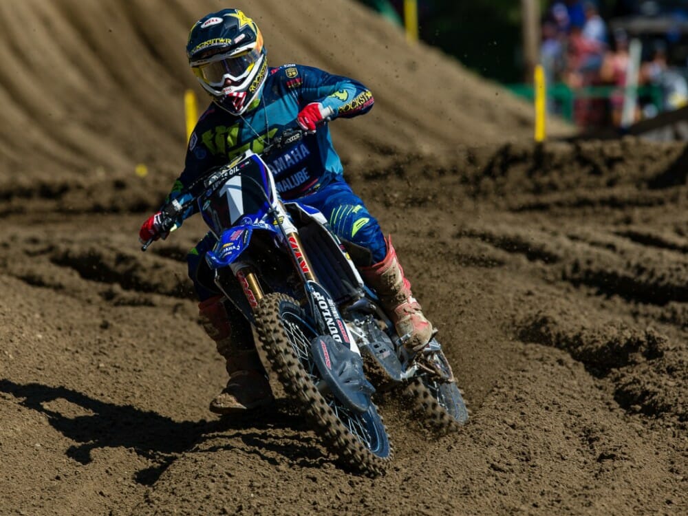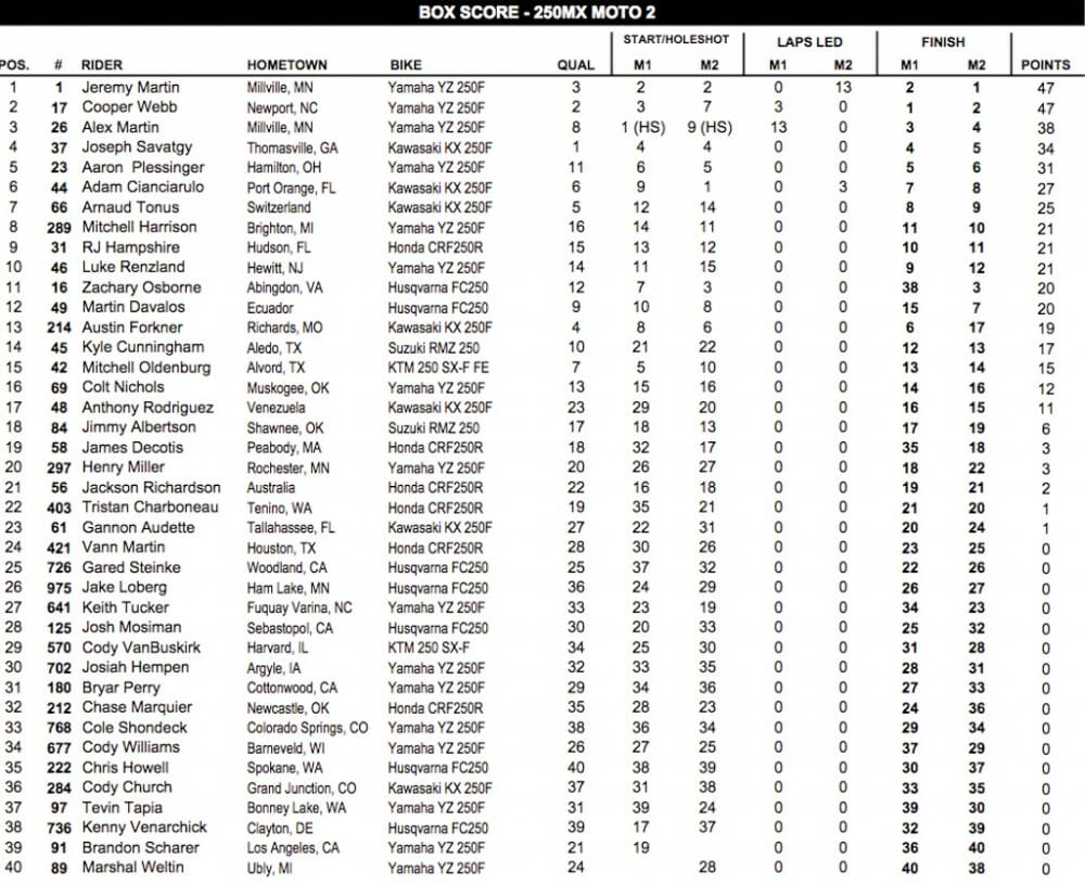 And that’s how they’d finish: Webb took the moto win—his fifth in the previous six motos—over Jeremy Martin, Alex Martin, then Monster Energy/Pro Circuit Kawasaki’s Joey Savatgy, and then a fourth Star Racing Yamaha in Aaron Plessinger rounding out the top five. Behind Plessinger came Savatgy’s teammates Austin Forkner, Adam Cianciarulo and Arnaud Tonus, with CycleTrader Yamaha’s Luke Renzland in ninth, and GEICO Honda’s RJ Hampshire as the only non-Kawasaki or Yamaha in the top 10. The fifth and final Yamalube/Star Racing Yamaha racer, rookie Mitchell Harrison, landed 11th at the finish.