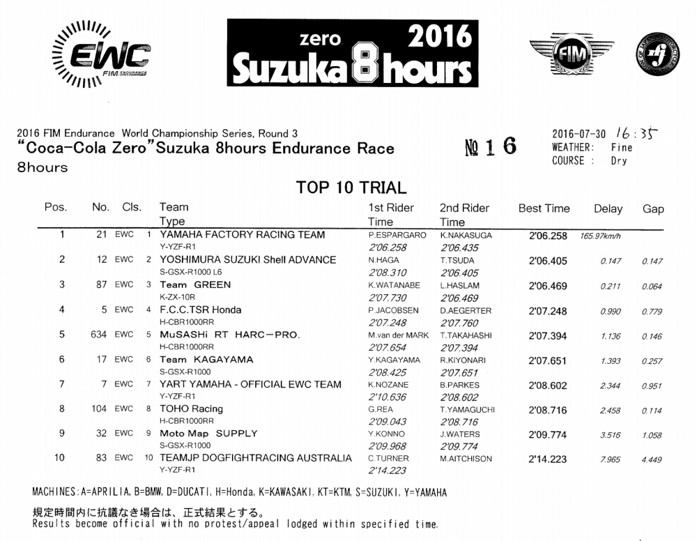 Team Kagayama (Suzuki) will start from 6th on the grid ahead of YART Yamaha Official EWC Team, Toho Racing (Honda) and Moto Map Supply (Suzuki).