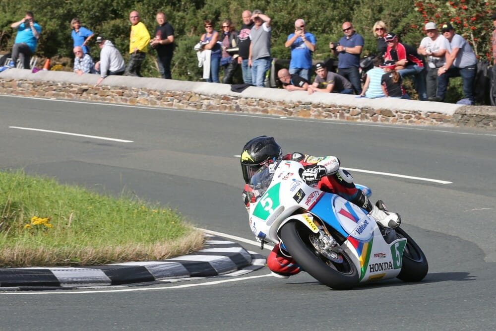Dan Cooper, the former 125 British champion, who was due to get away first, failed in a belated attempt to post a qualifying lap earlier in the afternoon and didn’t start. Michael Rutter on the Ducati was also absent from the start line, which meant that the much anticipated Valvoline Racing by Padgetts Motorcycles Honda 250 ridden by Bruce Anstey was first away. It was particularly poignant for Anstey, who won the last 250 two-stroke race at the TT in 2002.