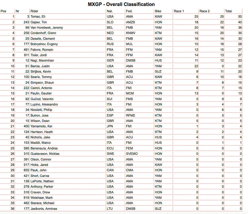In the second moto, Tomac, on the Monster Energy Kawasaki, got off to another fast start and led all but the first four laps after passing Gajser. Again, Tomac dominated the race, while Gajser had little troubles holding on to second for second overall.