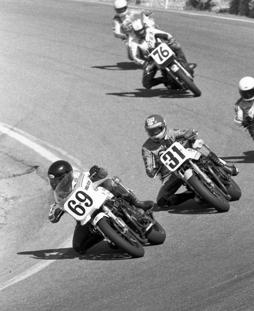 Liubimsky racing a Yoshimura Suzuki (No. 69) in the AMA Superbike race at Laguna Seca in 1981. (Cycle News Collection)
