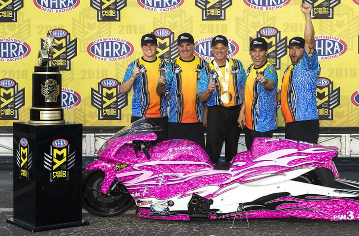 Racers came into the final round of the 2016 NHRA Mello Yello Pro Stock Motorcycle series at the Auto Club Raceway in Pomona, California in a near three-way tie for the championship. What has proven to be an unpredictable season full of surprises had come down to the NHRA final round, but rather than the winner-take-all final that was expected, White Alligator Suzuki’s Jerry Savoie earned the crown after his two closest rivals, Screamin’ Eagle Harley-Davidson teammates Eddie Krawiec and Andrew Hines, both lost in the second round. At that point, Savoie became the NHRA World Champion.