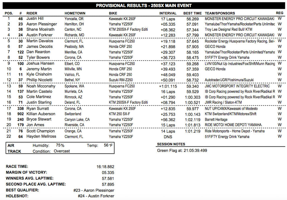2017 Anaheim Supercross 250SX Results