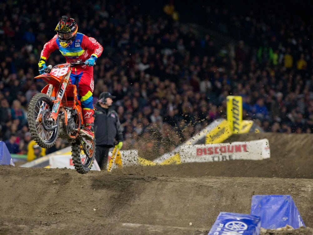 2017 Anaheim Supercross 250SX Results: Shane McElrath’s win streak came to an end in the 250SX West class at the Anaheim II Supercross in Anaheim, California, January 21. However, the TLD/Red Bull/KTM rider still finished out the night on the podium, in third, but the two riders nearest him in the standings finished ahead him—winner Justin Hill and Aaron Plessinger.