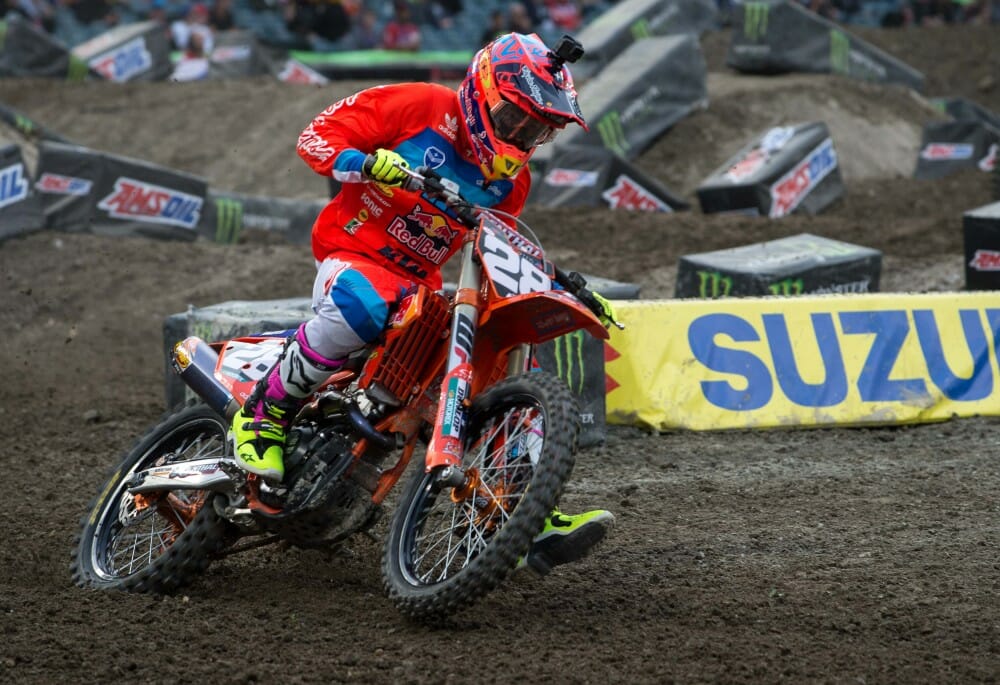 Martin turned it around the second time out and topped the 250SX West field overall. He was the only rider to crack the 1m:2s mark in the 250SX class with a 1:02.925. Next best was Justin Hill with a 1:03.242. Mitch Oldenburg is third quickest followed by the top rider in the first session, Aaron Plessinger. Shane Mcelrath rounded out the top five overall.
