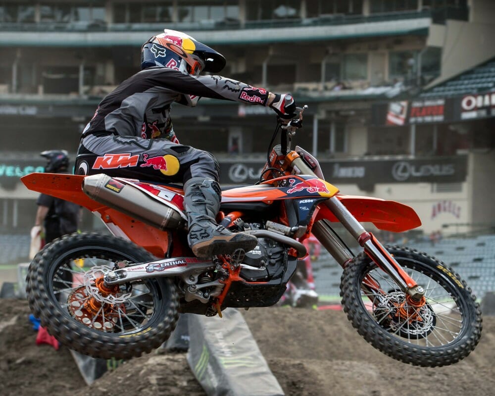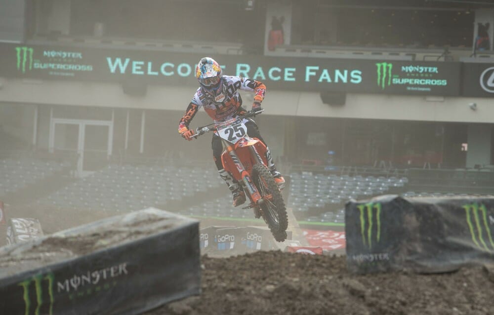 2017 Monster Energy Supercross Series Underway: It’s official, the 2017 supercross season is underway and the 450SX-class riders and 250SX West riders got the chance to take to the track for the first time under semi-sunny skies. Rain was in the forecast but not anymore, so it looks as though the opening round won’t be a mudder after all. Instead, after the plastic covering was removed over the track, dust was a slight issue in the first couple of practice sessions. A slightly altered schedule saw the cancellation of the first practice, so riders were on the clock right away for the first of two timed qualifying session.