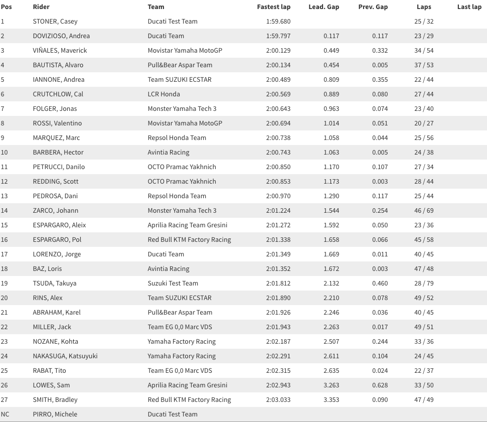 Hector Barbera rounded out the top ten for Avintia Racing with a 2:00.743 out of 38 laps, with Octo Pramac Yakhnich duo Danilo Petrucci and Scott Redding in hot pursuit. Petrucci, on the 2017 Ducati, clocked a best of 2:00.850 – with his teammate on the 2016 machine a mere three-thousandths in arrears on a 2:00.853.