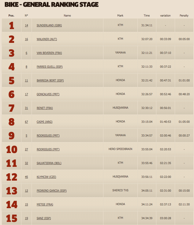 But despite Honda’s Stage 11 success, it does indeed appear likely Honda will not be putting an end to KTM’s winning streak as Sunderland sits a massive 33 minutes and nine seconds clear of fellow Red Bull KTM teammate and Stage 4 winner, Matthias Walkner with Van Beveren third—the Frenchman just 12 seconds clear of Spaniard Gerard Farres with one stage to go.