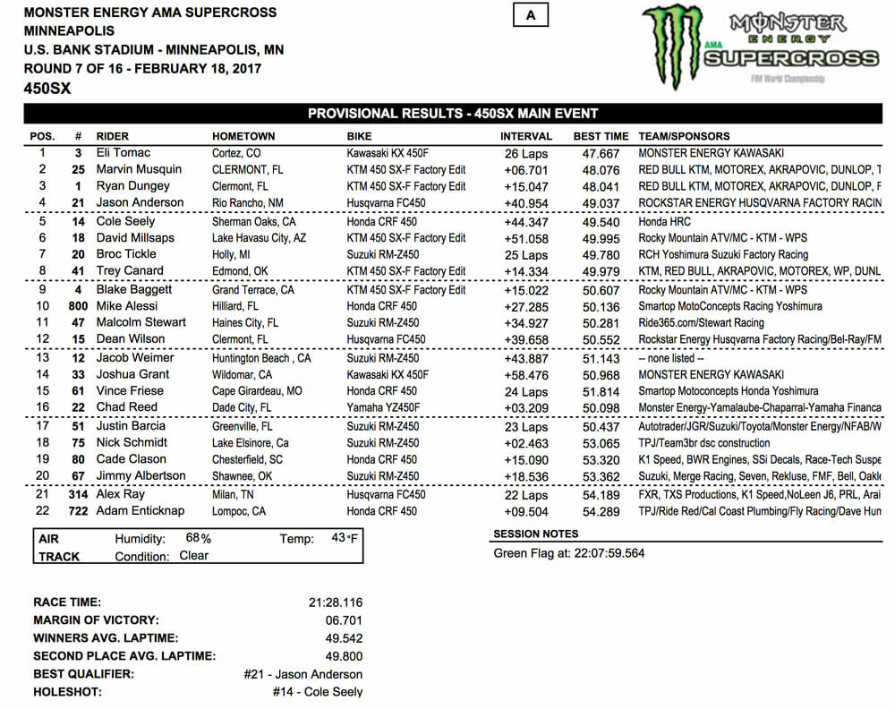 2017 Minneapolis 450cc Supercross Results: Monster Energy Kawasaki’s Eli Tomac was about to go on a tear after winning his first two races of the year at rounds four and five of the 2017 Monster Energy/AMA Supercross Series, but a fluke front-brake malfunction cost him big time at round six in Arlington, Texas. He showed up in Minneapolis ready to go to work, and promptly set the fastest qualifying time, a full second faster than Red Bull KTM’s Marvin Musquin in second.