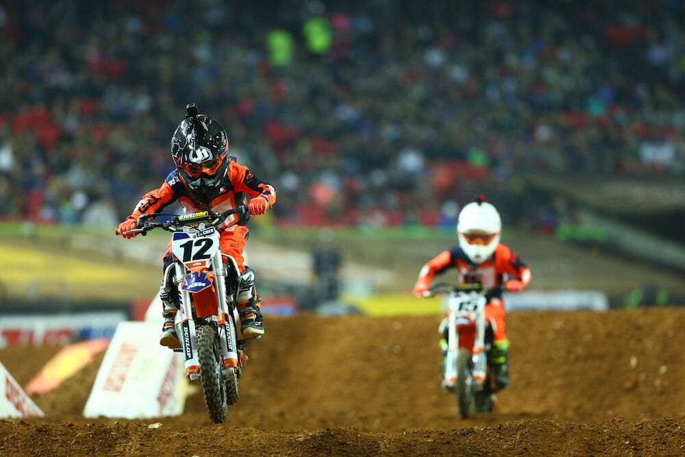 The KTM Junior Supercross Challenge riders showed off the TLD Youth GP Quest gear as they took to the track in front of thousands of fans. The front two riders of Emile Lacher and Drew Adams battled the entire three laps and as it came down to the wire, it was Adams who took the win. Rounding out the podium was Dannyn Reed.