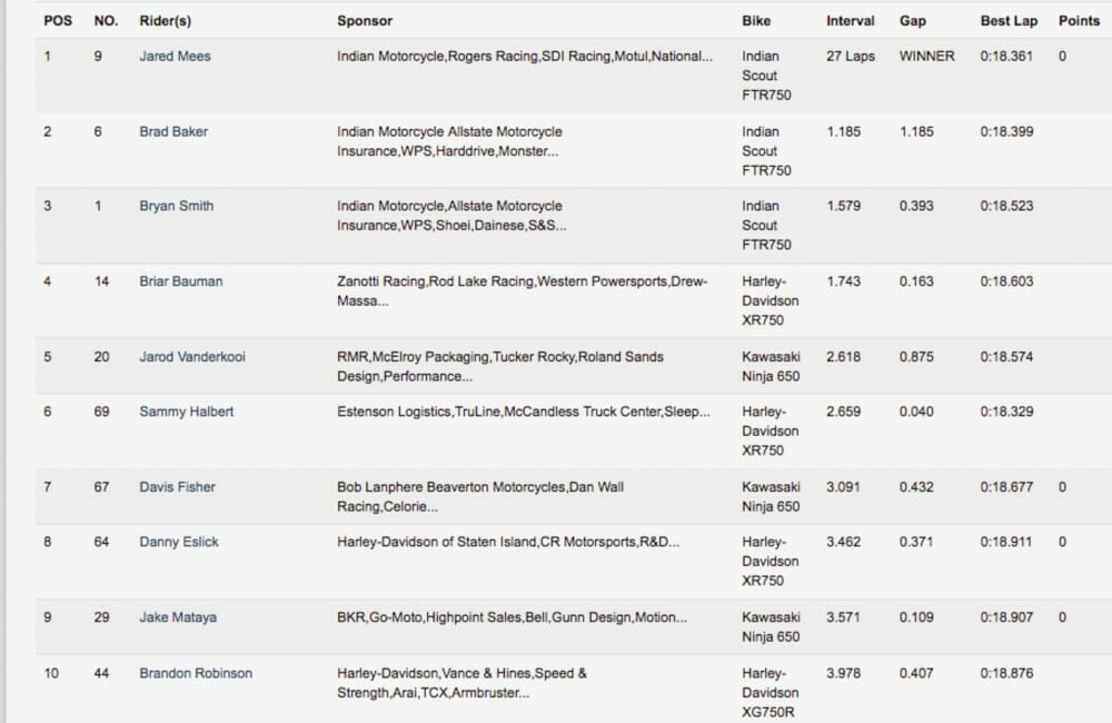 It was another fierce battle for top honors in the AFT Twins presented by Vance & Hines class, with Mees on the No. 9 Indian Motorcycle Rogers Racing Scout FTR750 locked in a back-and-forth battle with Sammy Halbert on the No. 69 Estenson Racing Harley-Davidson XR750. The pair made contact, resulting in Halbert ending up in the dirt on the front straight and bringing out a late-race red flag. When the race restarted, Mees pulled away in the ensuing five-lap shootout to win by 1.185 seconds over Indian Motorcycle Racing backed by Allstate teammates Brad Baker on the No. 6 Indian Scout FTR750 and Bryan Smith on the No.1 Indian Scout FTR750.