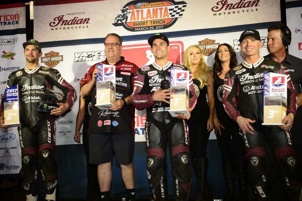 2017 Atlanta Short Track Results – One week after giving Indian Motorcycle its historic first victory in American Flat Track competition at Daytona International Speedway, Jared Mees made it two in a row Saturday evening with his win at the Atlanta Short Track presented by Indian Motorcycle. The three-time Grand National Champion was part of a podium sweep for the Indian “Wrecking Crew” in front of a near-capacity crowd at Dixie Speedway in Woodstock, Ga.