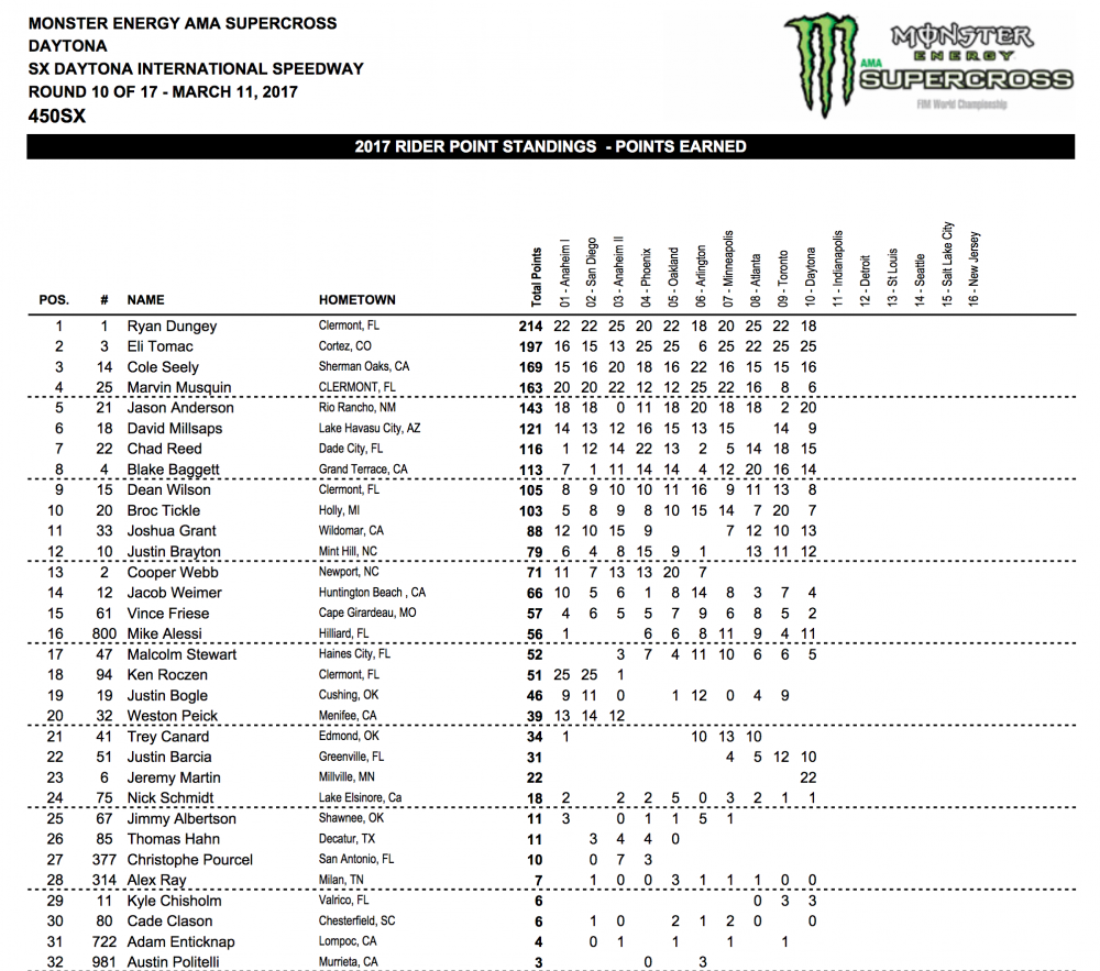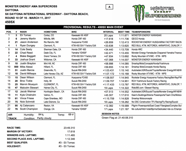 2017 Daytona 450cc Supercross Results