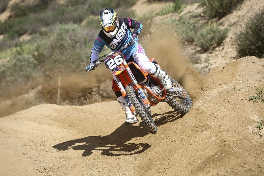 Pulling out onto the local track riding a 450 SX-F Dungey-replica with large number ones adoring three surfaces is a lesson in ignoring staring eyes. It’s an attention-getter—that is for sure.