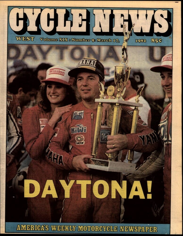 In 1982 Crosby, by now a third-year Grand Prix rider, now riding for factory Marlboro/Agostini Yamaha, he came back to Daytona again and this time won the big one, the Daytona 200. He raced a steady race while almost all the other top runners experience problems in a race of high attrition.
