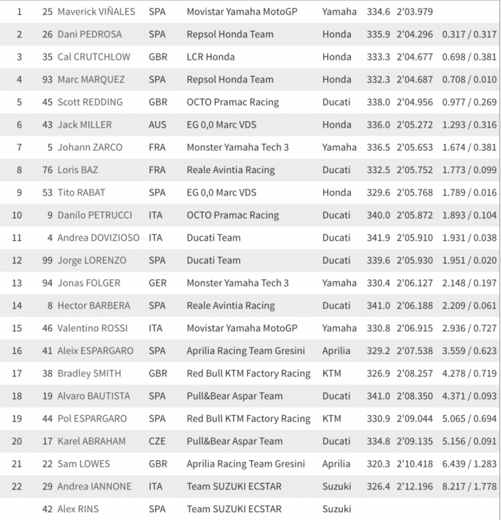 Aleix Espargaro was another dual crasher in 16th, with Jorge Lorenzo, Alex Rins, Alex Lowes, Andrea Iannone, Andrea Dovizioso and Alvaro Bautista all going down.