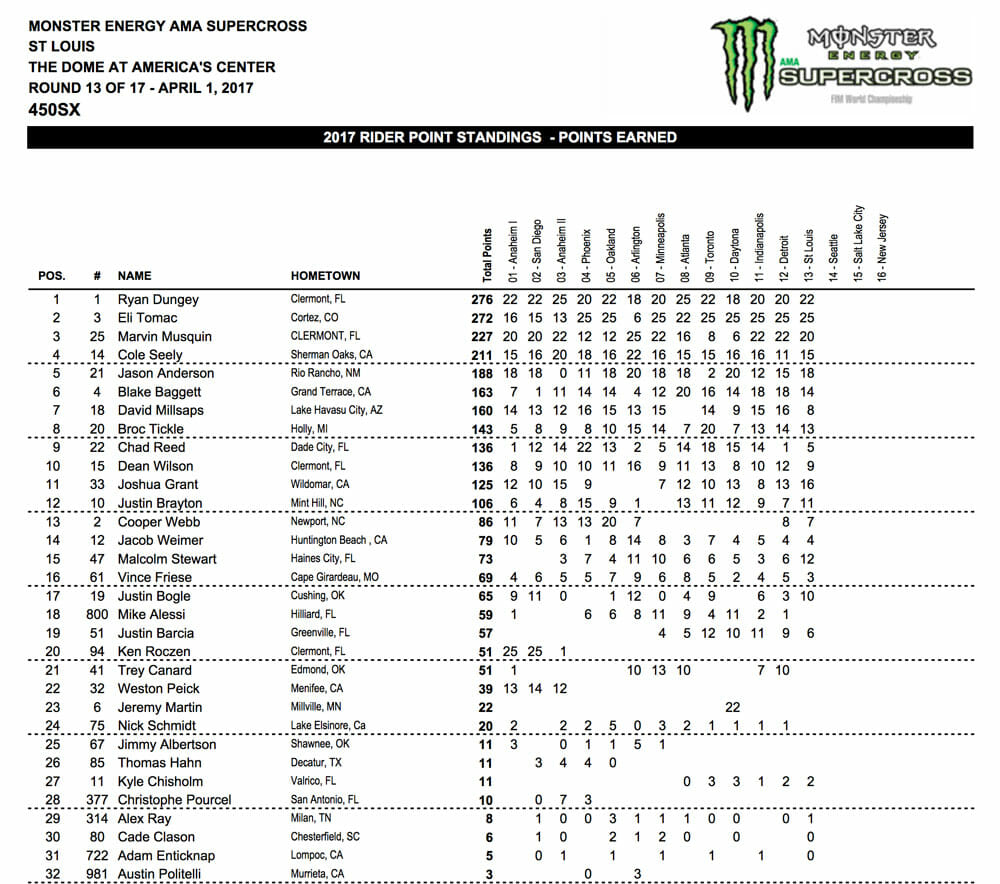 2017 St. Louis 450 Supercross Results: Tensions are high, and every race now the championship is getting tighter. Defending 450cc Supercross Champion Ryan Dungey has had a tough go of it for the past few races, with Monster Energy Kawasaki’s Eli Tomac taking four wins in a row as the series headed to St. Louis. On top of that, two races in a row, Dungey also couldn’t stop his Red Bull KTM teammate Marvin Musquin. Dungey won his heat race on his way to the main event, although he had to deal with a game Chad Reed who cut over on Dungey through the whoops immediately after he passed the champ for the lead early in the race. Dungey took exception to it during his podium interview after the heat race. Tomac qualified first in timed qualifying, but a terrible start in his heat left him with the final transfer spot in fourth.
