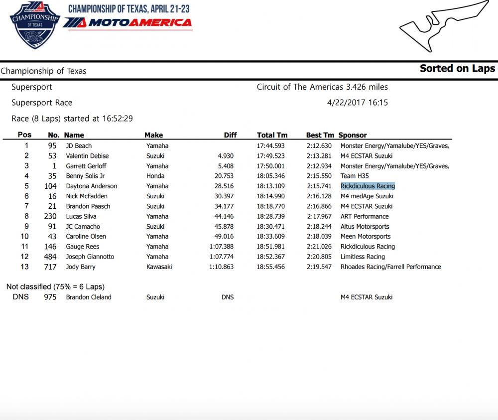 COTA MotoAmerica Supersport Race One Results