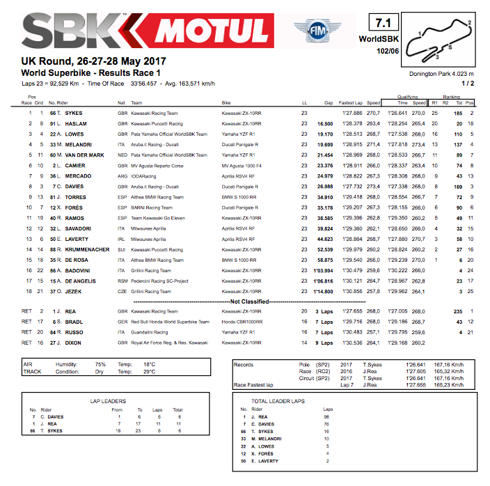 In the championship Sykes is exactly 50 points behind Rea now, with one more Donington race to come on Sunday.