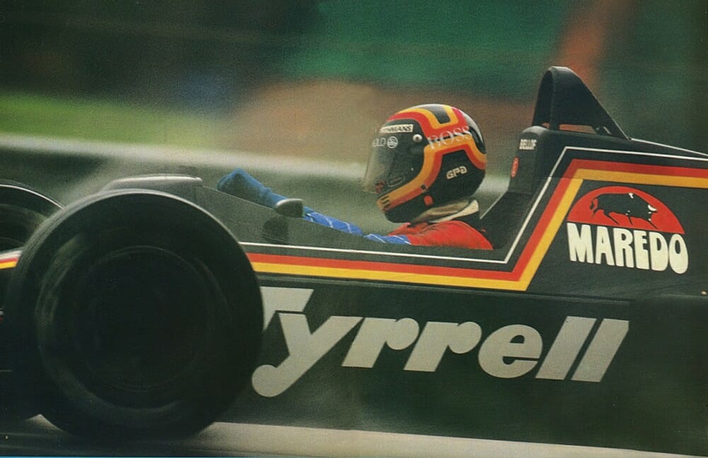One of the photos I gave Tag was of the late Stefan Bellof, a German Formula One racing driver killed in 1985 killed in an accident during the 1985 1000km of Spa World Sportscar Championship race. Bellof’s helmet was easily recognizable—the red, yellow and black of his native Germany a symbol of his speed. Tag took a shine to that helmet and used it as the basis for my design, incorporating the top graphic while adding a thick red stripe down the middle, green and gold around the bottom of the helmet and a faint, ghosted Kangaroo in purple flake down the side.
