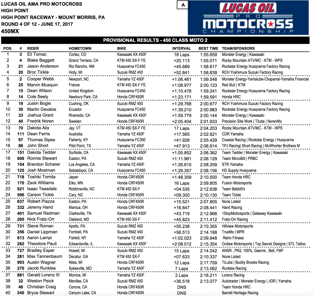 Tomac ended up taking the win by over 20 seconds ahead of Baggett, then came Anderson another 25 seconds back, then Tickle, Webb, Musquin, Wilson, Seely, Bogle and Davalos. Grant ended up 11th after crashing out of seventh with just a few laps to go.