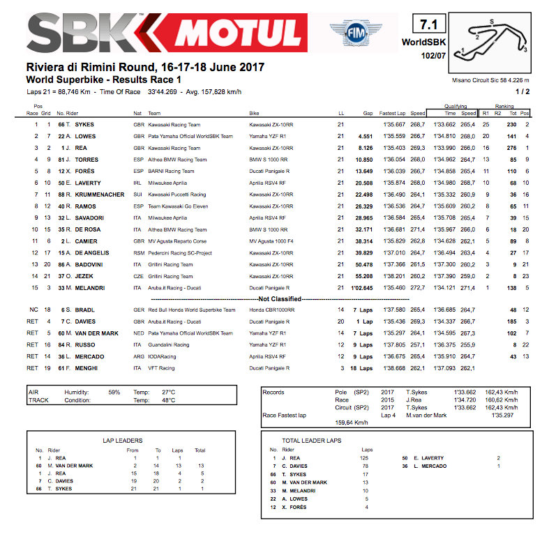 2017 Misano WorldSBK Race One Results