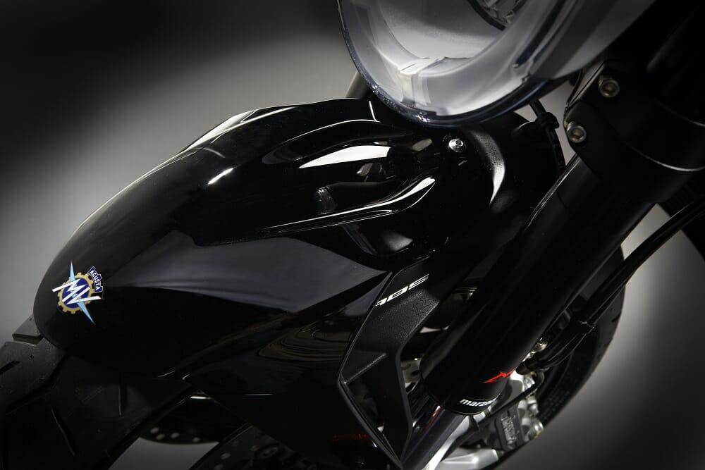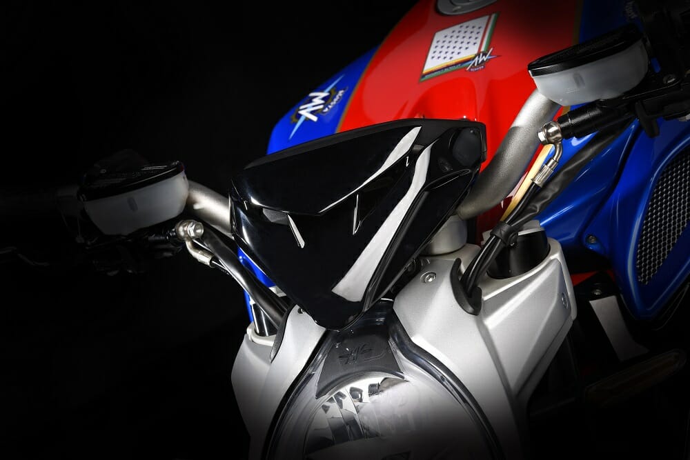 To define the America, the MV Agusta design team wanted to match the exuberance of the country that bears its name, in a special livery. From its rich culture, individuality, patriotism, innovation and the United States flag, the team set about bringing the passion of these elements into a never-before-seen metallic blue color scheme that catches the light with a shimmering iridescence. Whilst on the tank, a star-studded motif, like the one on the 1973 MV Agusta 750 S, takes the brand back to its glory days. Elsewhere, gloss black paintwork brings out the best in component details, such as the front fender, which sports the MV Agusta logo.