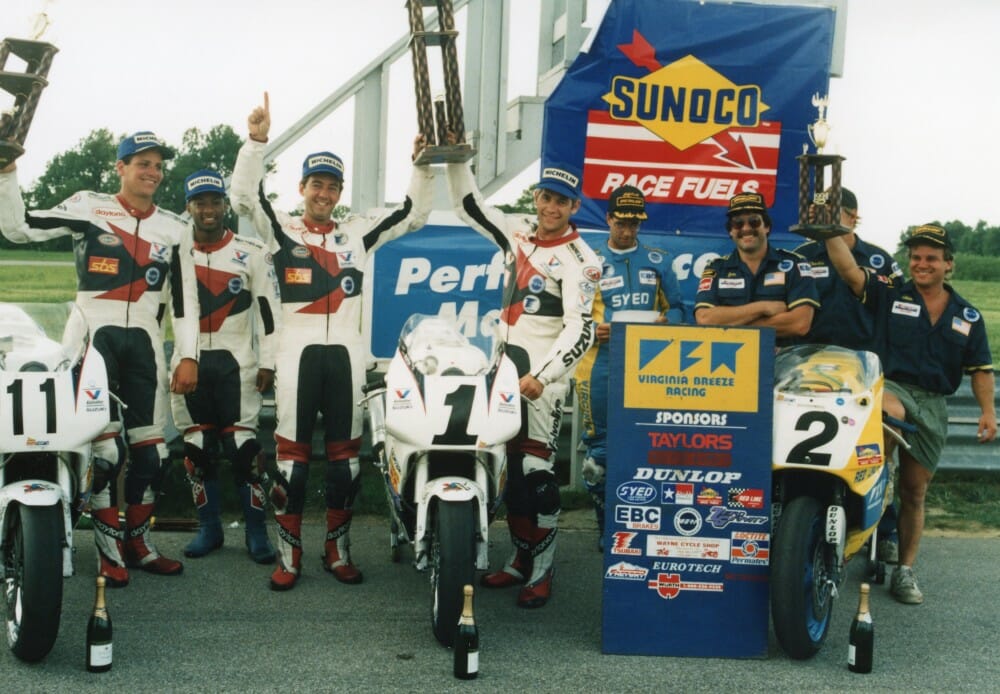 It was a very good day for Team Suzuki Endurance on this July day at Putnam Park. Team Suzuki fielded two teams, both racing Suzuki GSX-R1100s, and they finished first and second. The interesting thing was the veteran No. 1 team of Michael and Tray Batey, both in their mid-30s at the time, beat Team Suzuki’s B squad of young guns David Stanton and Steve Patterson, who were both in their early 20s.