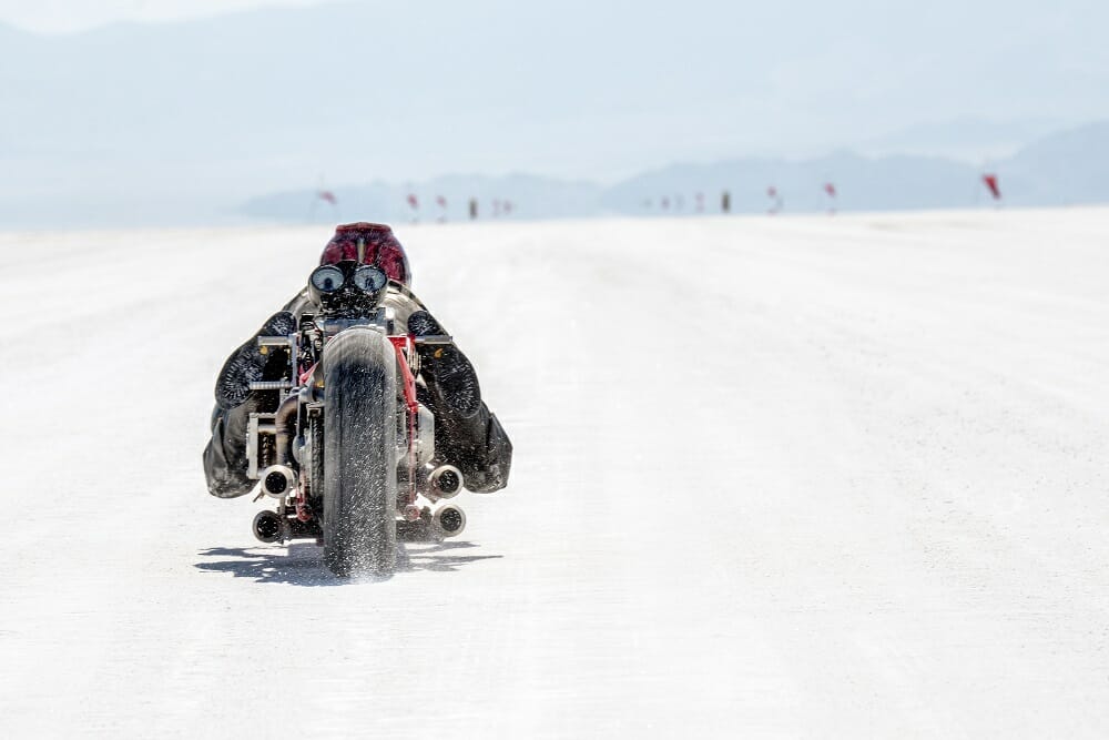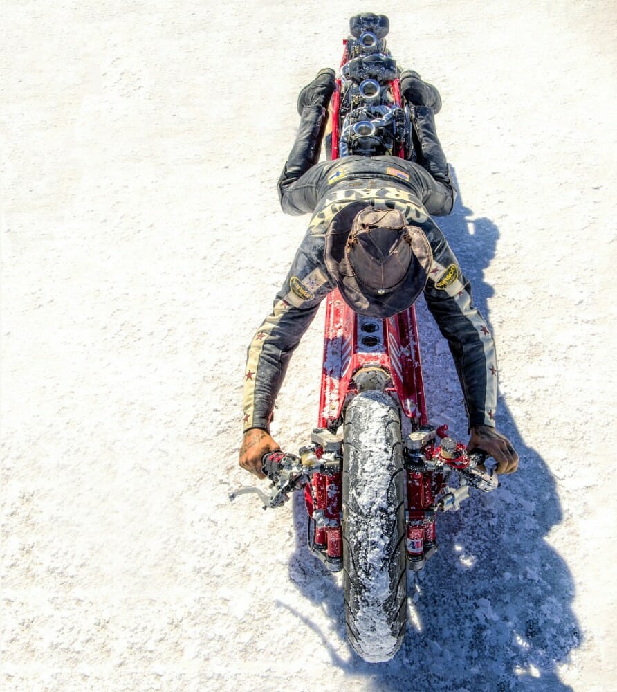 “There are many stories I could tell about each of the runs on the bike. Most of them I couldn’t see properly because of the salt spray off the front tire, and it’s hard to keep it straight because the horizon is always moving. It was very stable at high speeds with that steering arrangement, but you could feel the rear tire spinning up repeatedly. I didn’t have any gauges to look at in front of me—they were out back! So I could only go by vibration because I couldn’t hear anything but wind noise. But I’m just so happy to be alive. I went off-course twice, and ran over lots of flags, but only broke my brake reservoir, which kept falling off, so I did most of the passes with no brakes available. Didn’t seem to affect the performance any!