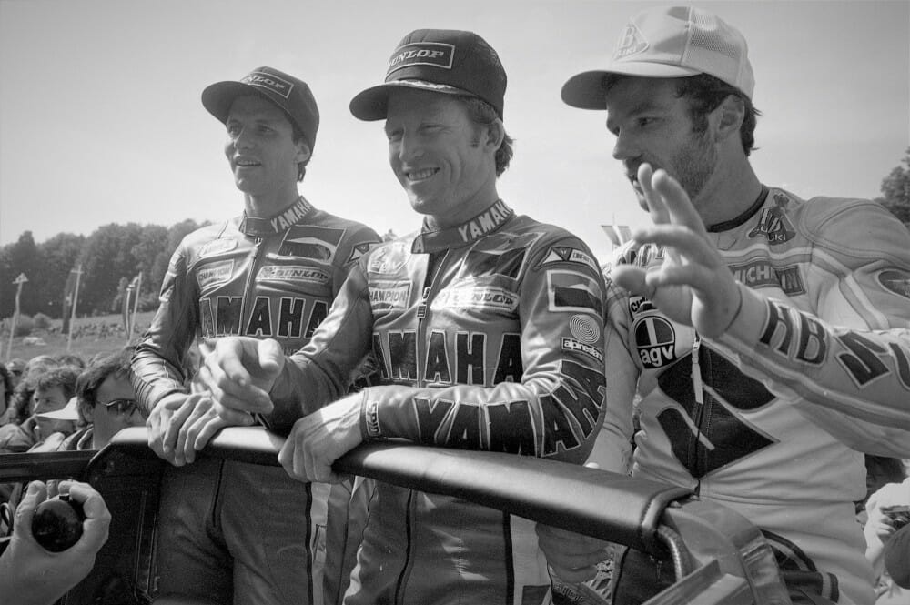 Kenny Roberts (center) smiles after winning the Austrian Grand Prix at the Salzburgring in 1983 ahead of his Yamaha teammate Eddie Lawson (left) and Suzuki factory rider Randy Mamola. (Photo by Henny Ray Abrams)