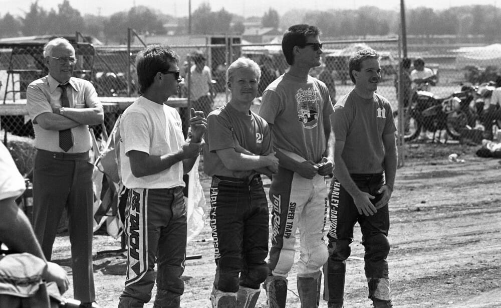 Mitch Friedman happened to catch a great photo during the 1987 San Jose Mile with Bubba Shobert, Chris Carr, Doug Chandler and Scott Parker standing side by side during rider introductions.