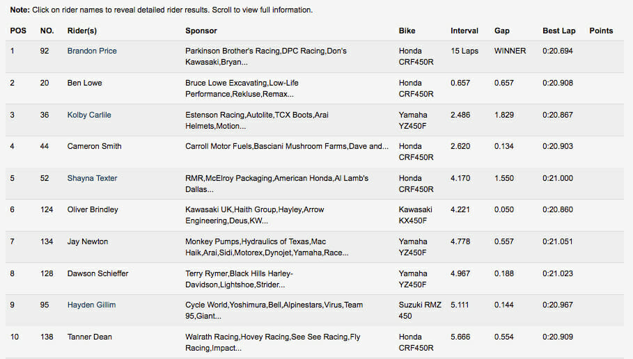 Price said, “It was a crazy race. I came off the line like sixth and really had to work for it. Every couple laps I’d pick up somebody and make a pass. I rode a smart, clean race.”