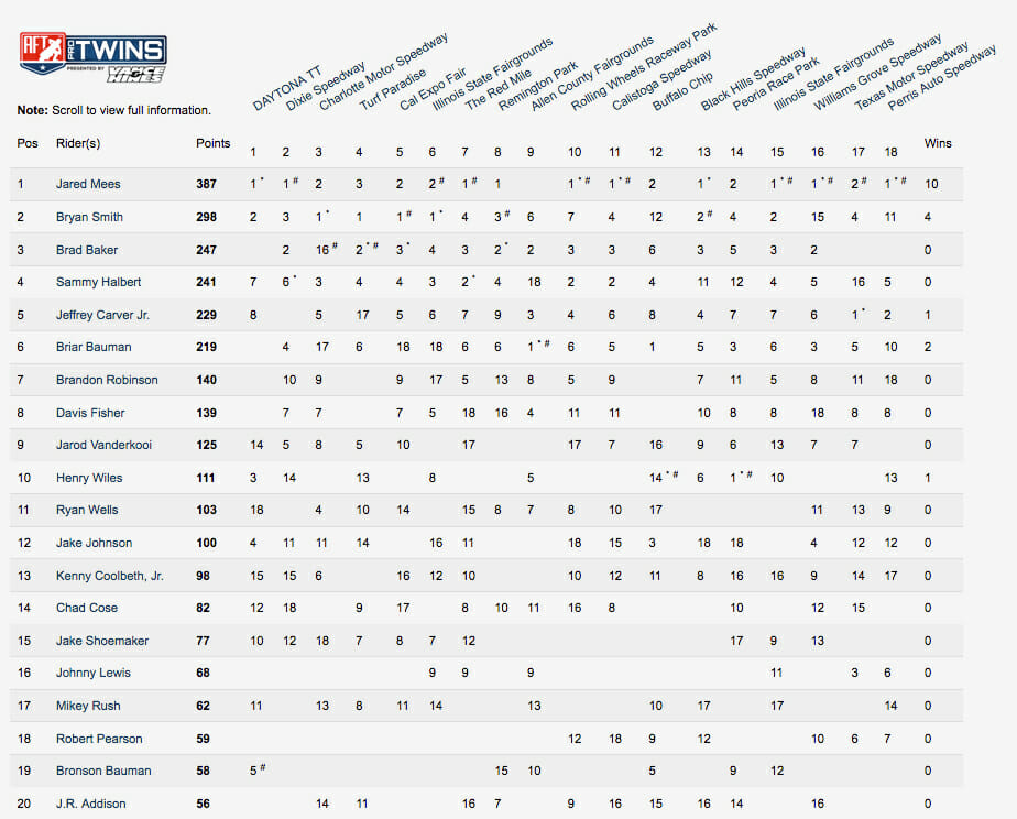The final numbers confirm that Mees’ 2017 campaign was of historic excellence. His season finale win saw Mees establish the new single-season podium record, surpassing the previous mark held jointly by American Flat Track icons Scott Parker and Ricky Graham. Mees ended the year with 17 top threes in 18 attempts, but perhaps even more impressive than the sheer number was the manner in which those podiums were tallied; 10 came as victories, six were runner-ups, and just one was a third.