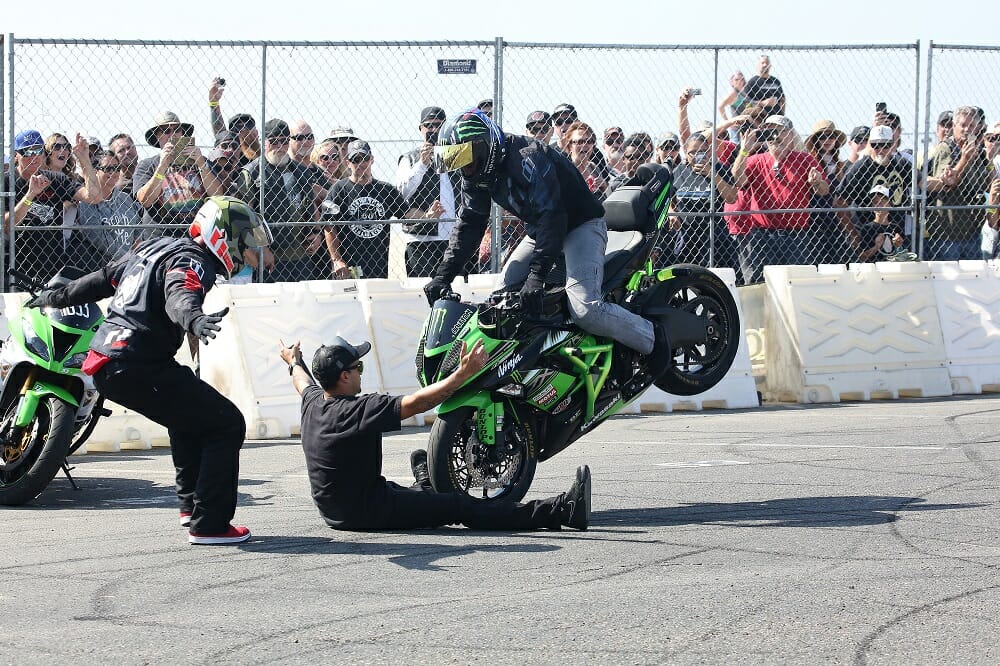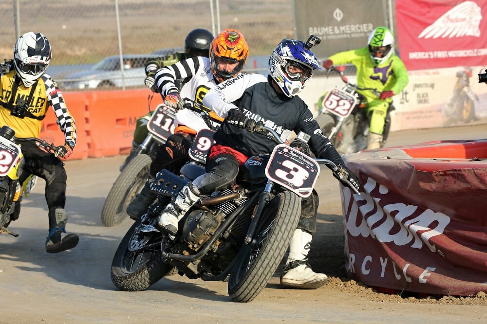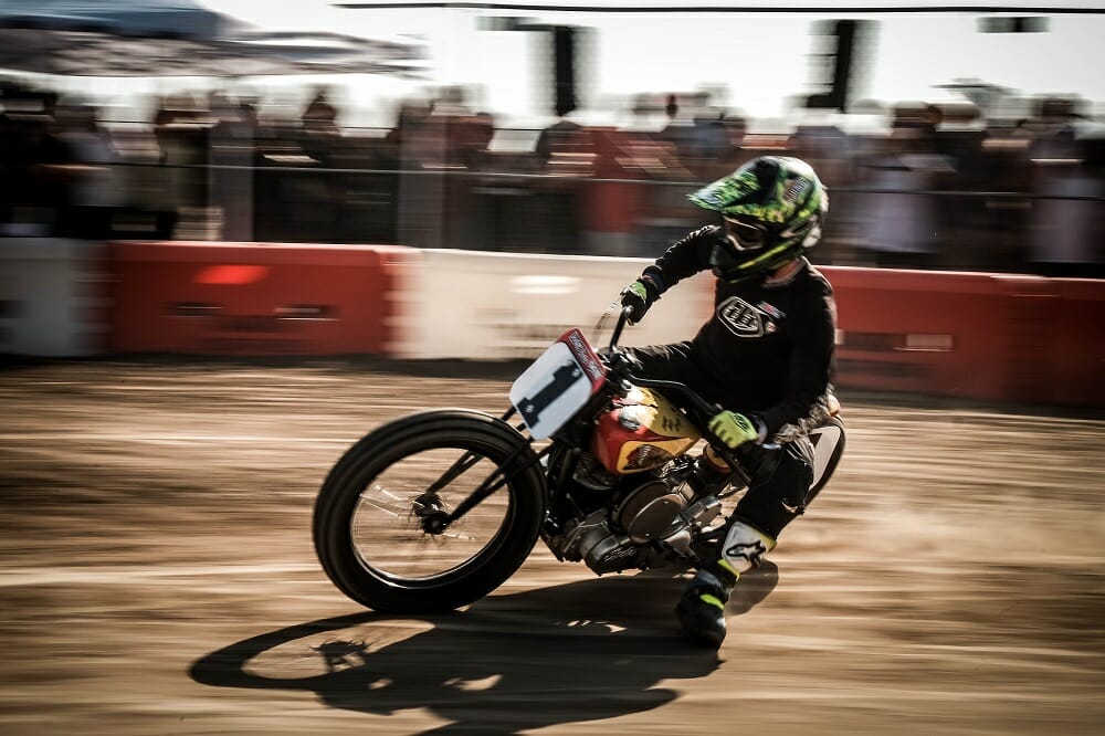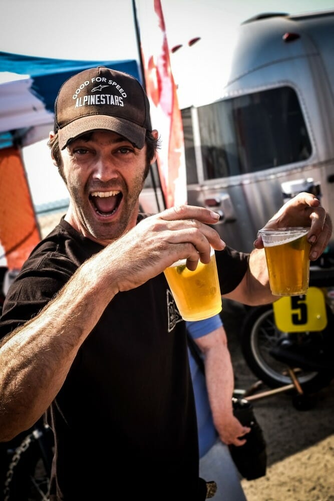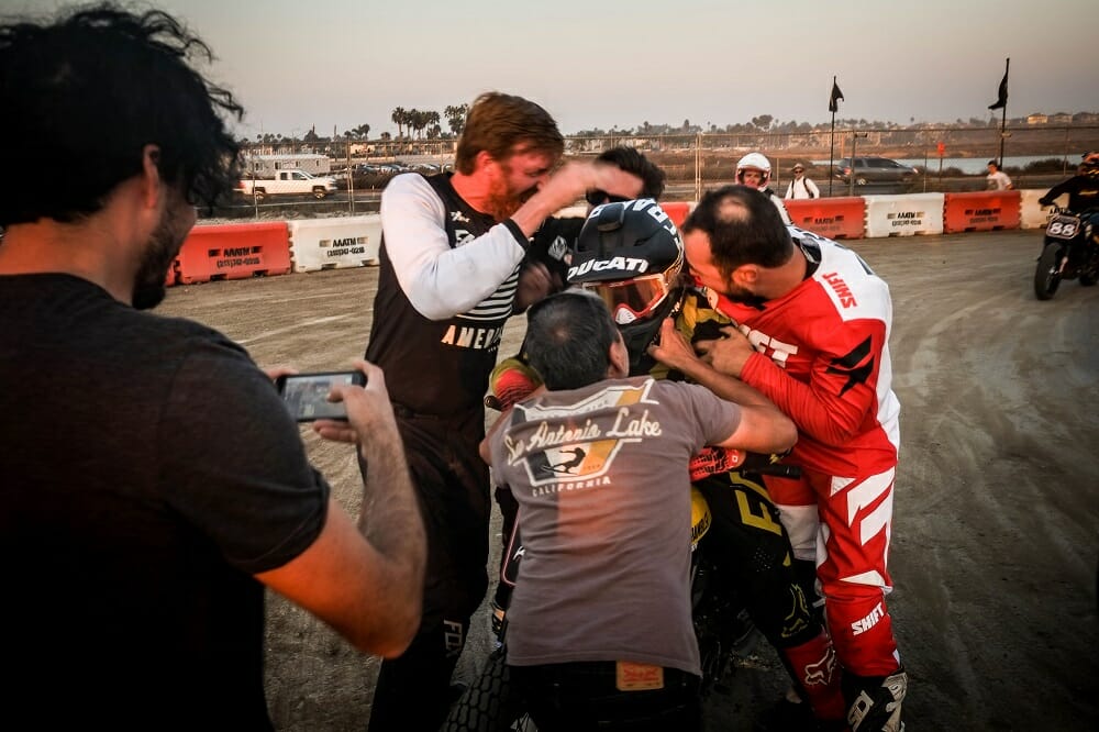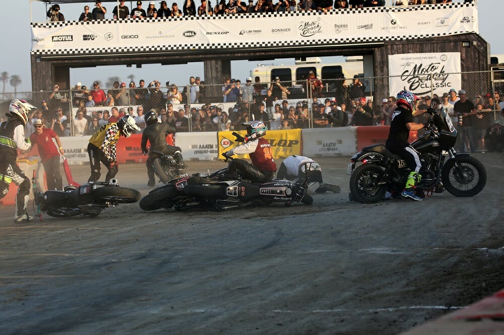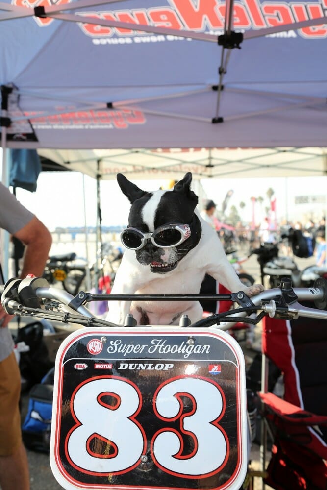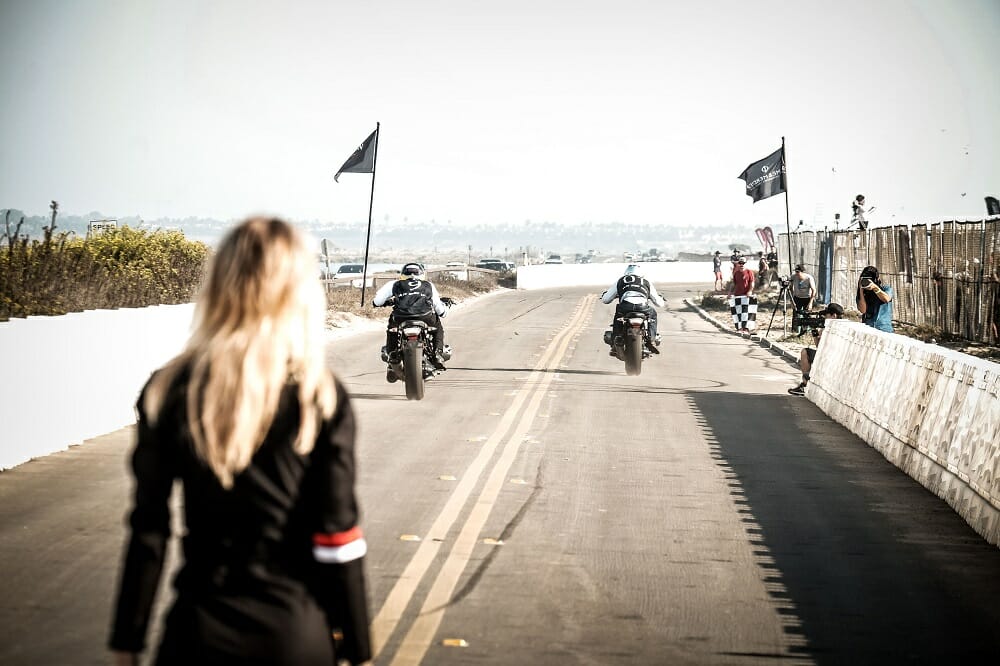 Frankie Garcia was in full send-it mode in the final, taking a stunning win in his first RSD Super Hooligan event.You had to look the part if you wanted to race in the retro-shifter class.Old bikes were made for racing.The mini moto event saw some seriously quick youngsters take the stage.Wherever there’s beer, Motogeo’s Jamie Robinson isn’t far away.Nico, the bike-riding Frenchy, tries the Cycle News Yamaha SCR950 on for size.There were some incredible bikes on display from all over the country.Some of the riding skill on display with these old bikes was phenomenal.Former AMA GNC number-one Joe Kopp lost out big time at Bolsa Chica; he led the points going into the meeting but missed out on the title (and a new Indian Scout FTR750) by one point.Wargirl’s lead singer Marika Dahlin shreds it for the masses.Flag girl Leticia Kline sends another two BMW R nineT’s down the Salty Strip for the BMW drag races.Our Road Test Editor Rennie Scaysbrook had a bruising encounter at Bolsa Chica with a big crash, but managed to take second in the B Final.Local Rob Dixon is fast becoming known as the man with the biggest smoke show in Huntington Beach.This is what we call trust!Turn one, lap one of the B Final was a yard sale.The Huntington Beach coastline was at her spectacular best.Kopp (3) tries valiantly to keep his title hopes alive as DiBrino (62), Dash For Cash winner Mikey Hili (63) and Garcia (obscured) lead him in the A Final.Garcia is congratulated by his dad and friends for taking an unexpected win.DiBrino walked away with a $50,000 Indian Scout FTR750 for his Super Hooligan Championship win.