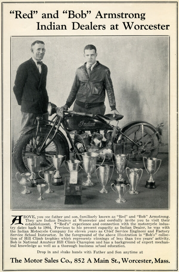 In 1906, Armstrong took a job making 30 cents per hour as a mechanic for a Denver Indian dealership. He worked 10 hours a day, six days a week, to be able to afford to race. Armstrong became one of the best racers in the Denver area. He cut his teeth racing in Denver on the board track at Tuileries Park. He won his first race in 1906 and was dubbed “Red” for his brightly colored hair.
