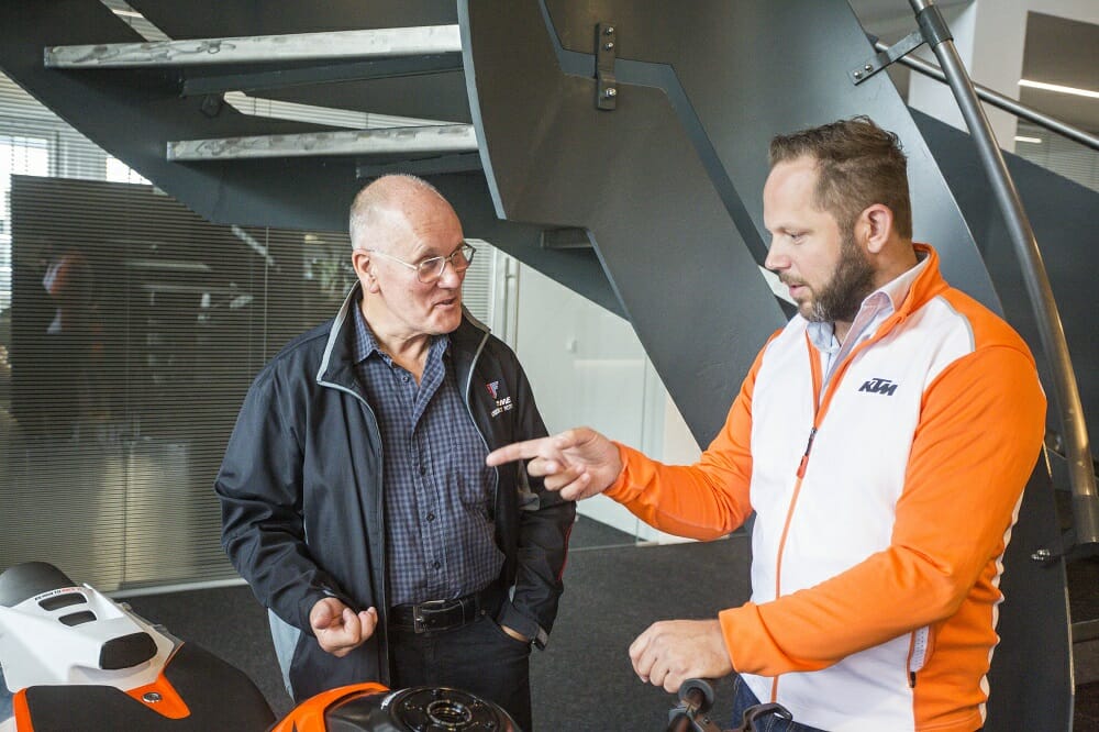 “We think we have a good offering in the entry level and lower capacity on-road sectors with our smaller singles made in India by our Bajaj partners,” says Kiska. “We get our customers started on riding bikes with the 125 and 200 Dukes, then we take them to the next stage with the 390 or 690 singles—but after that we lose them to another manufacturer, because we don’t have a middleweight model to offer them. Okay, maybe we get them back again later on—but not necessarily, so that’s about to change with this bike you’re riding, which we think is the answer to that hole in our range.”